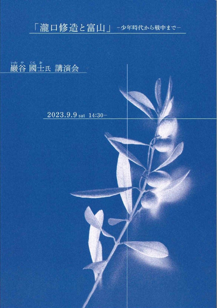 巖谷國士氏を富山へお招きして、講演会を行います。 今年は瀧口修造生誕120年。瀧口の故郷富山にて瀧口修造を語っていただきます。 日時 令和5年(2023)9月9日(土)午後2時30分から 場所 富山市オーバード・ホール内ハイビジョンシアター 入場料 1000円 (当日受付にて) 定員 先着順40名 申込:090-8260-3304(三谷・ミタニ) メール:t.g.kenkyu@gmail.com 主催:瀧口修造研究会会報「橄欖(かんらん)・富山」